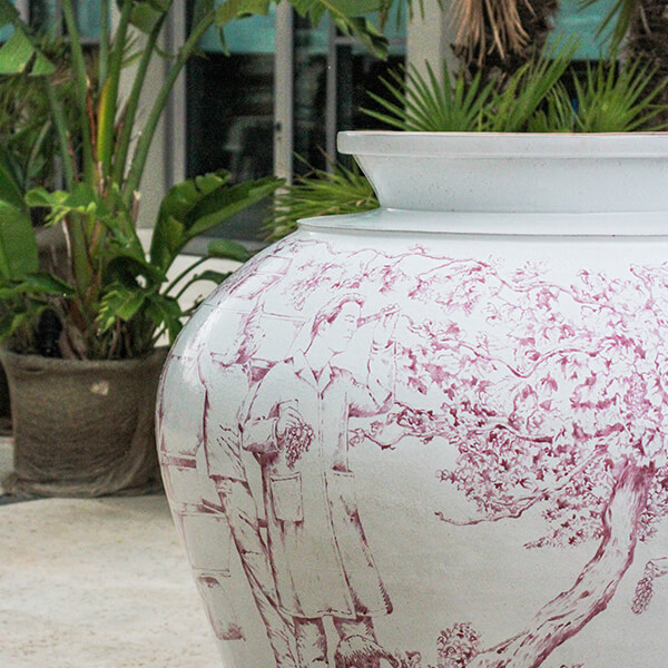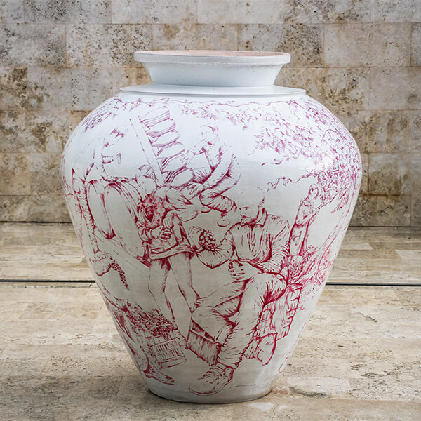 L’artista ha scelto di raccontare il ciclo della vita del vino sulla superficie di un’anfora, usata dai tempi più antichi per l’affinamento del vino.