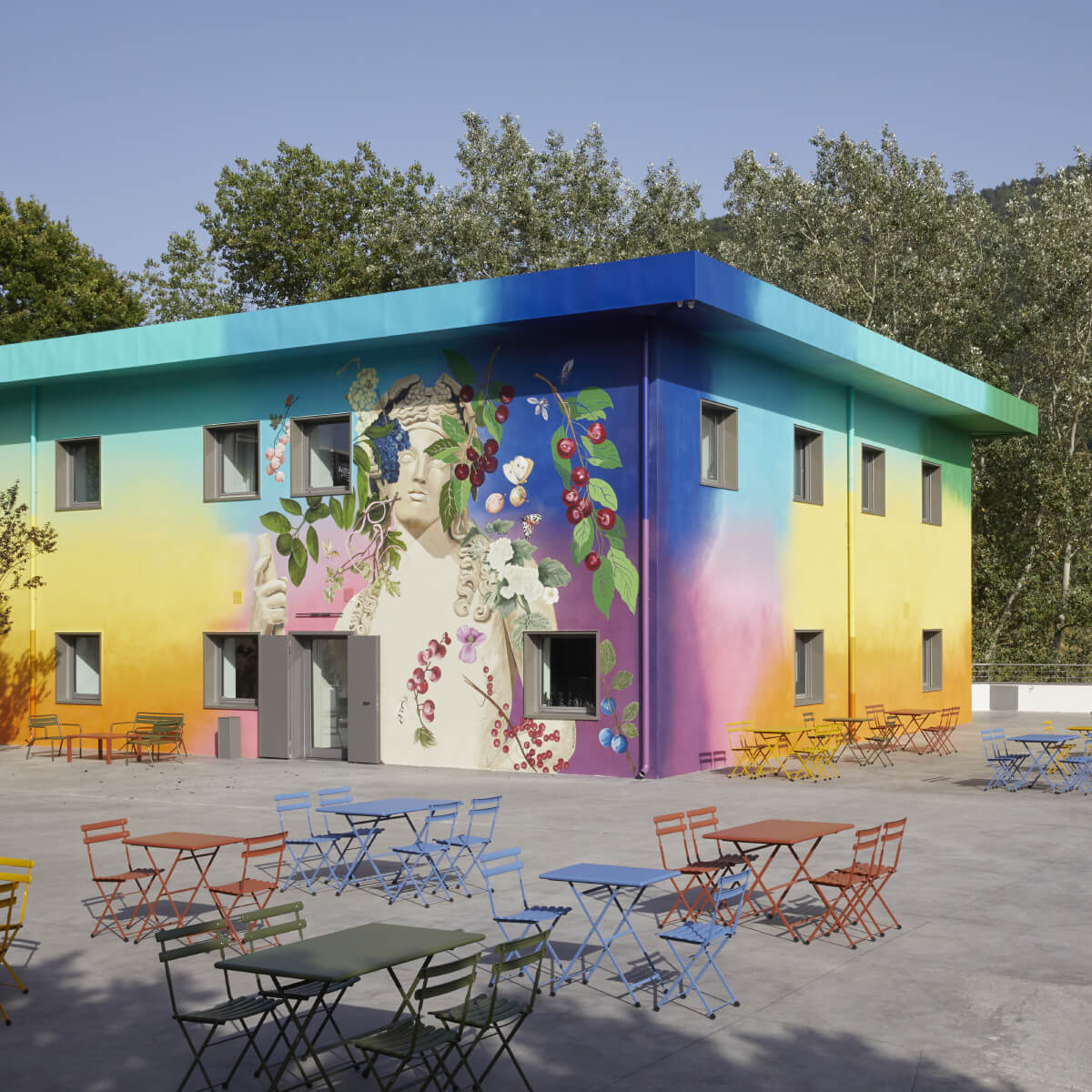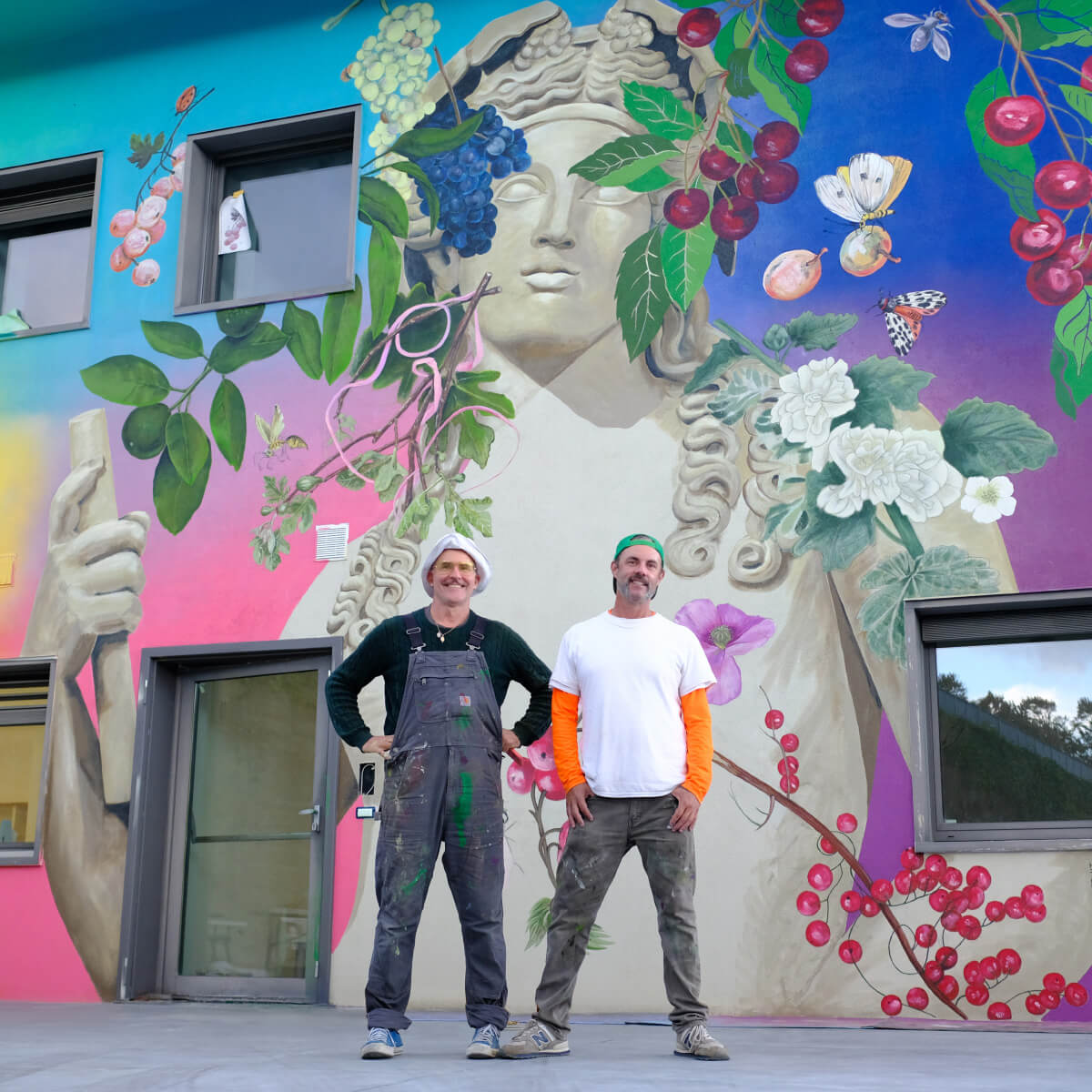 Il duo californiano firma questo progetto artistico con il consueto approccio colorato e barocco che li caratterizza, compreso un omaggio al Dio del vino e del piacere nell’angolo nord-ovest dell’edificio.